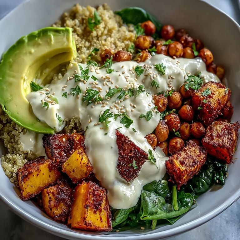 - Divide the quinoa among four bowls and arrange the roasted sweet potatoes, crispy chickpeas, fresh spinach, and sliced avocado on top. Drizzle generously with that tahini yogurt sauce and serve immediately while everything still has those lovely contrasting temperatures.