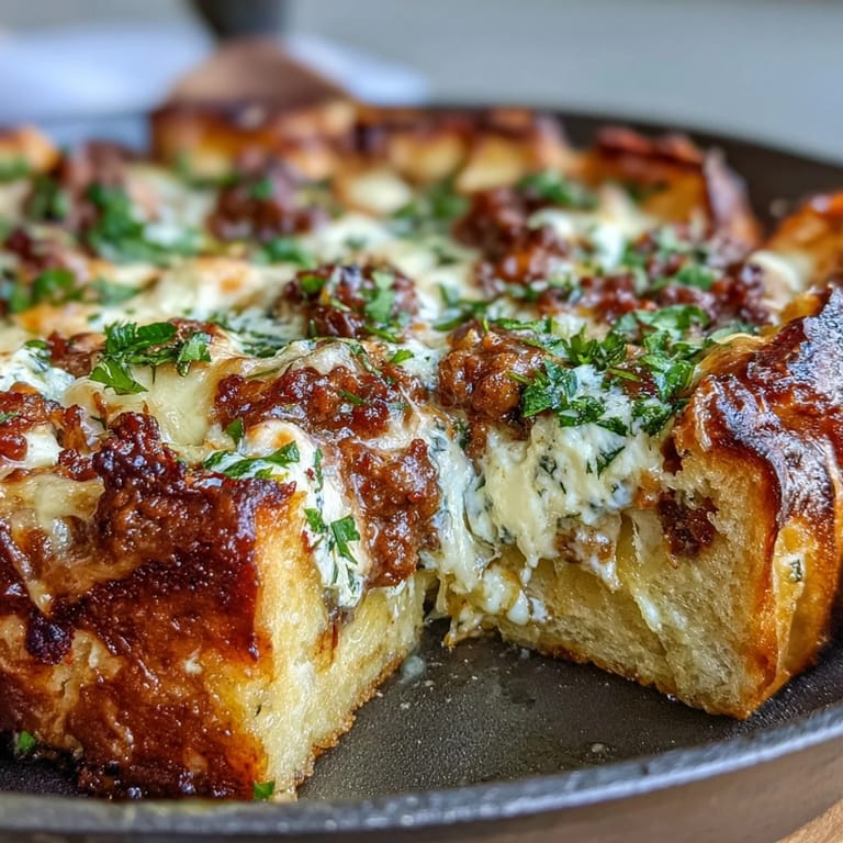 Pin it My friend Marcus showed up at my apartment one rainy Friday with a cast-iron skillet and what he called "lasagna chaos in a pan." He'd been craving lasagna but didn't want to fuss with noodles, so he'd simply cubed up some Italian bread, tossed it in garlic butter, and layered it like he was building something completely new. Watching him pull it from the oven—golden, bubbling, smelling like every Italian grandmother's kitchen—I realized he'd accidentally invented something genius. Now I make it whenever I need to impress people without the fussy assembly.