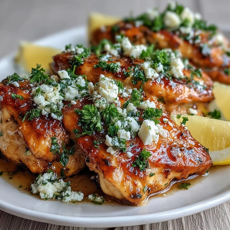 - Transfer the chicken to a serving plate and drizzle it with that reserved marinade you set aside earlier. Scatter the crumbled feta and chopped parsley on top, then tuck lemon wedges around the edges for squeezing.