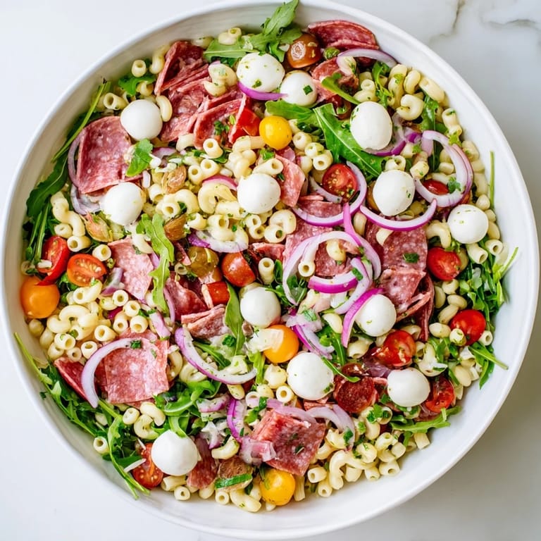 - Add cooled pasta, arugula, salami, mozzarella, pickles, onion, and tomatoes to the bowl with dressing